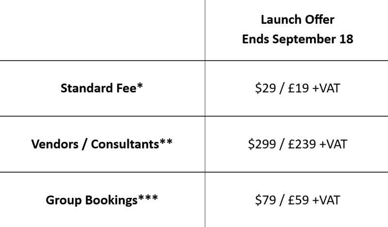 Use this category if there are multiple people within the same organization who would like to attend. Simply register one person now, and you will receive instructions via email on how to add up to 30 colleagues. This option is not available for Vendors/Consultants.